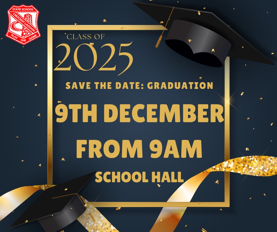 The 2025 Crescent Lagoon State School Year 6 Graduation will be held in the school hall on the 9th of December from 9am.