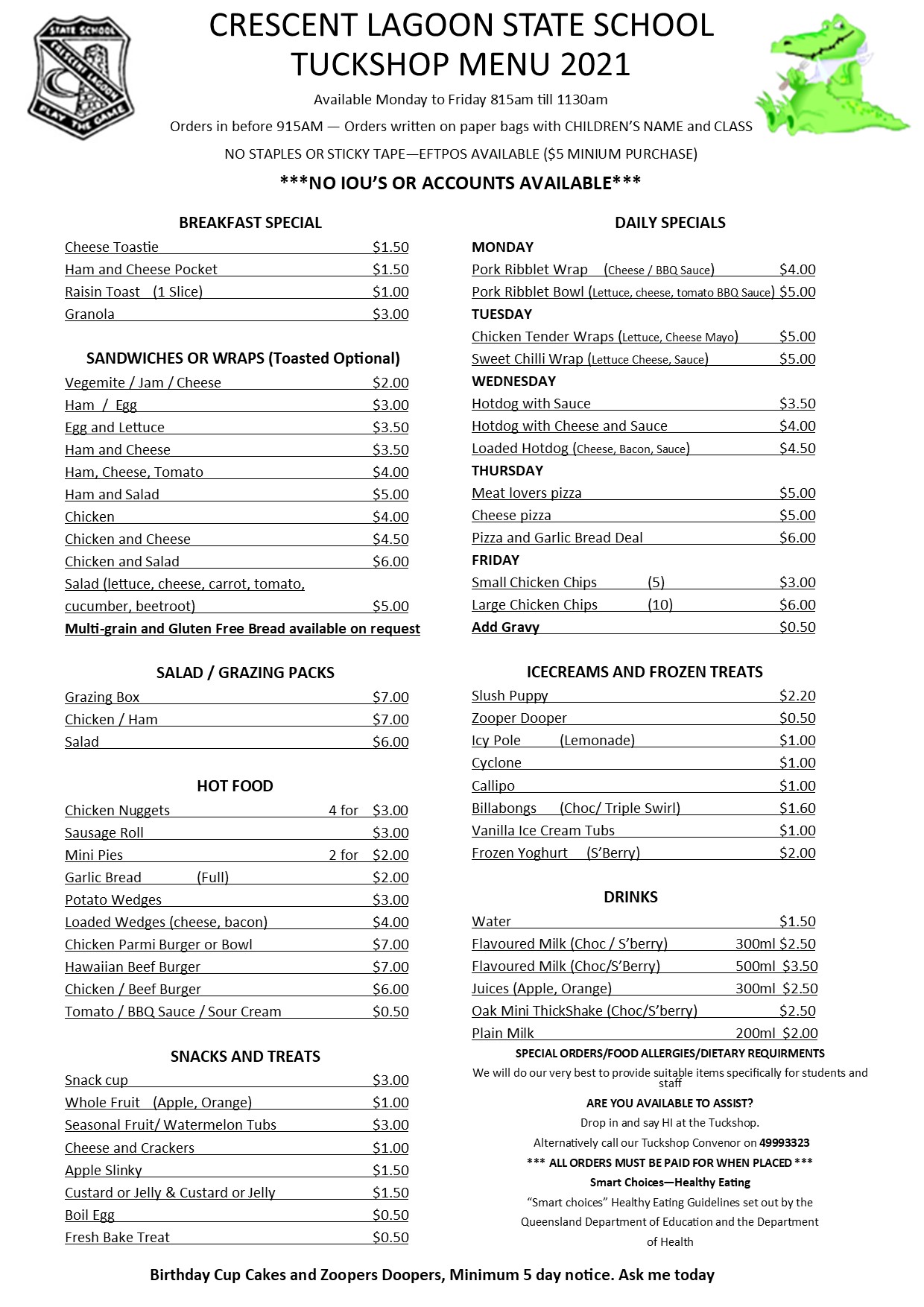The tuckshop will now operate on Monday through to Friday. Orders are to be in by 9:15am to allow enough time to prep and pack orders.